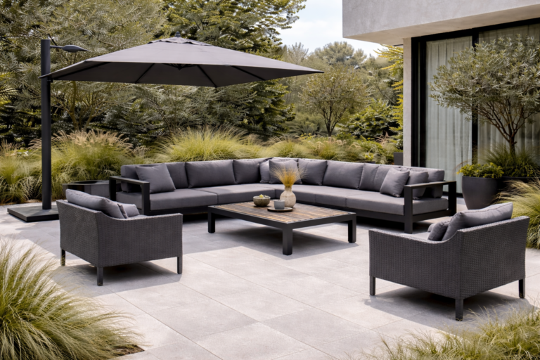 Na kompaktowych tarasach antracyt najlepiej prezentuje się w prostych, lekkich formach. W połączeniu z minimalistyczną bryłą sprawia, że przestrzeń wygląda nowocześnie, a nie ciężko. Taką równowagę oferują nowoczesne zestawy mebli ogrodowych o zwartej formie, które nie przytłaczają nawet ograniczonego metrażu.