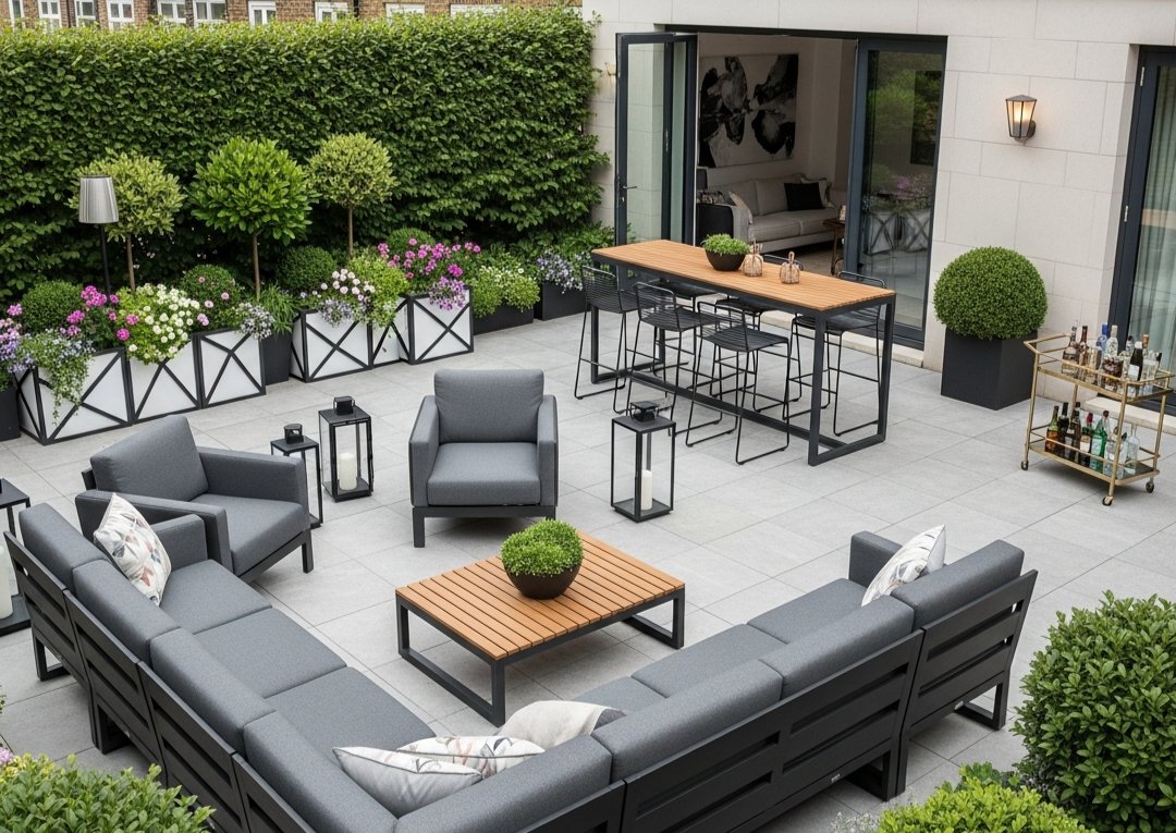 W tej roli sprawdzają się masywne meble ogrodowe o zwartej konstrukcji oraz komfortowe zestawy wypoczynkowe o wyważonej bryle, które doskonale wpisują się w aranżacje eleganckie i nowoczesne.